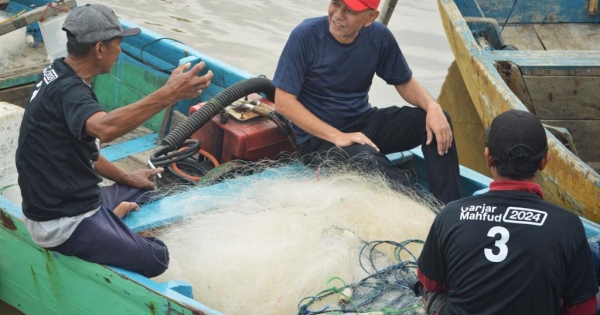 Nelayan dan pedagang ikan yang menyadari kedatangan Politikus PDI Perjuangan ini berbondong-bondong menghampirinya.
